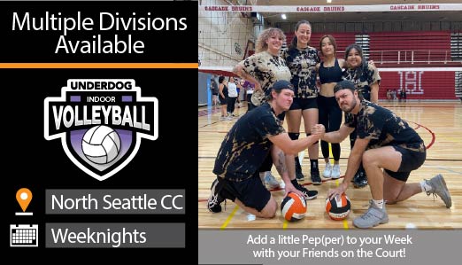 Bump, Set, and Spike with Underdog! Volleyball is back at Seattle Central Community College for 6 games of regular season action, plus playoffs for qualifying teams. Softcore and Midcore divisions are available. Grab a couple friends and sign up now!